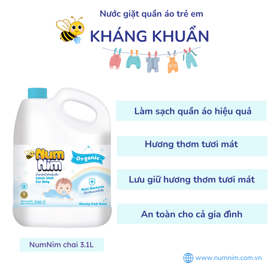 NƯỚC GIẶT QUẦN ÁO TRẺ EM NUMNIM KHÁNG KHUẨN – Anti Bacteria – Màu xanh giúp loại bỏ vi khuẩn hiệu quả, dịu nhẹ với làn da nhạy cảm của bé yêu, lưu giữ hương thơm tươi mát dài lâu. Với dung tích lớn 3100ml, đây là lựa chọn tối ưu chi phí, mang lại hiệu quả vượt trội và sự an tâm tuyệt đối cho mọi gia đình.