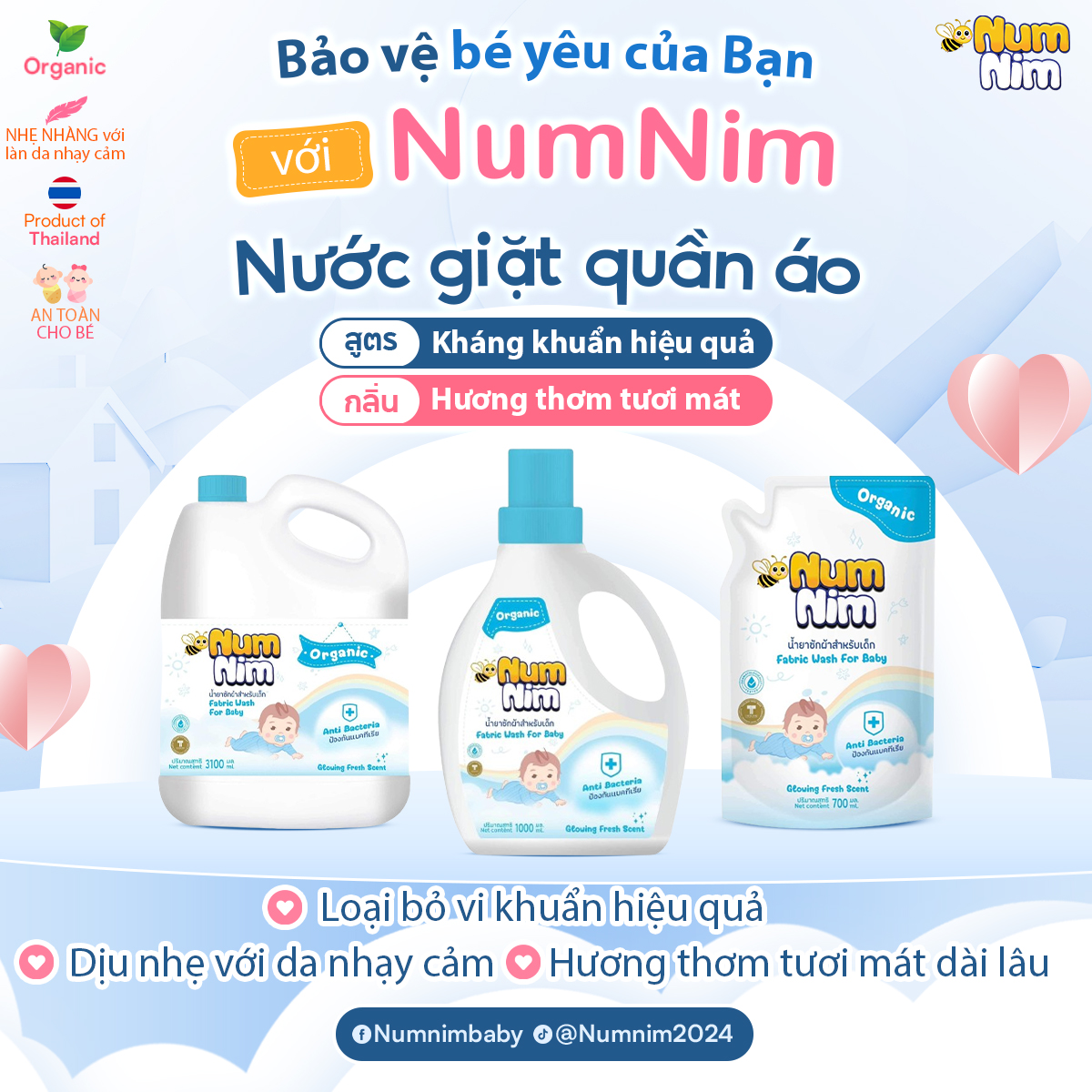Nước giặt quần áo trẻ em NumNim – được sản xuất tại Thái Lan và nhập khẩu chính hãng, đạt tiêu chuẩn chất lượng cao cấp được nghiên cứu dành riêng cho làn da mỏng manh của trẻ sơ sinh và trẻ nhỏ: an toàn và dịu nhẹ