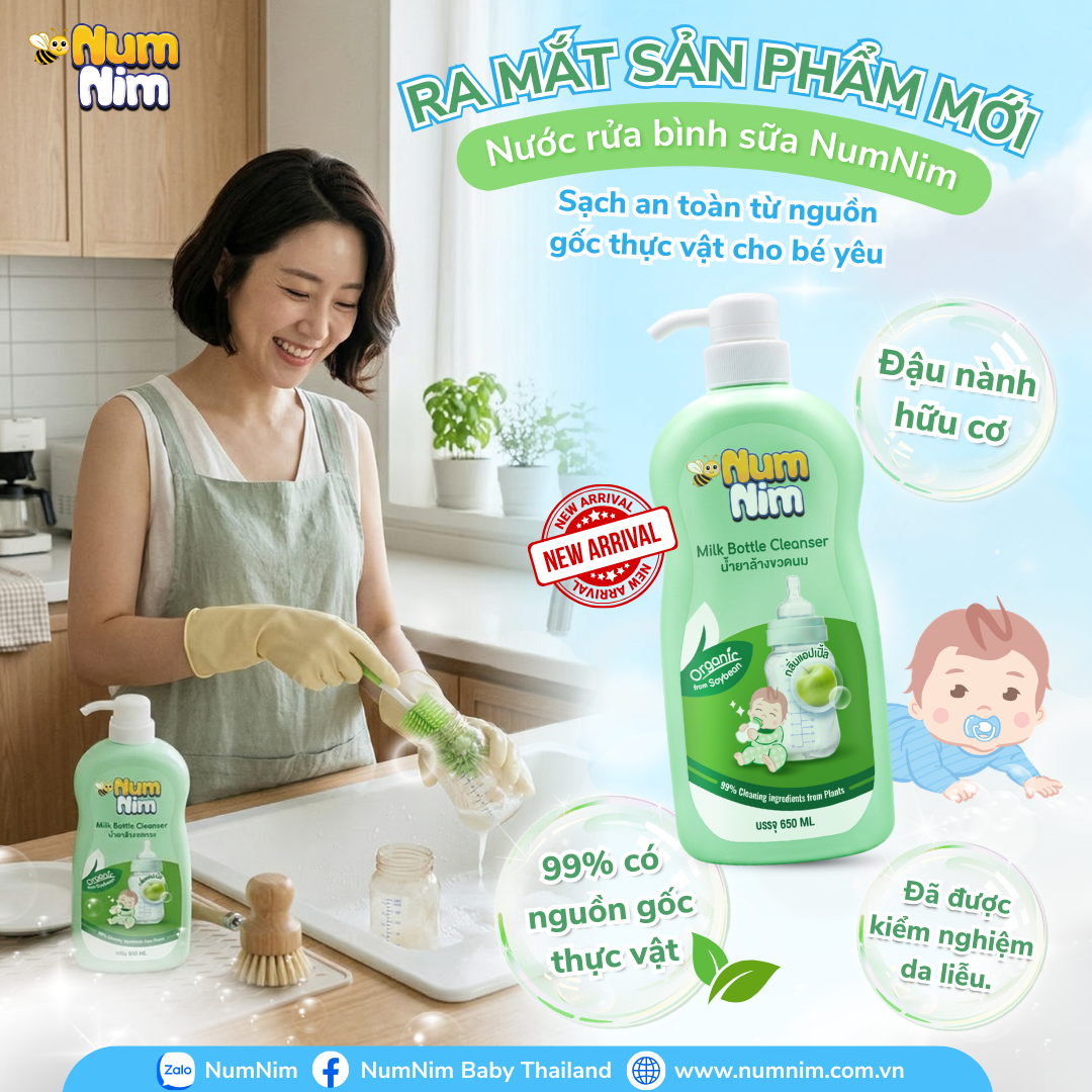 Nước rửa bình sữa NumNim — 99% thành phần từ thực vật, chiết xuất dầu đậu nành hữu cơ, nhập khẩu chính hãng Thái Lan. Rửa sạch bình sữa an toàn, bảo vệ da tay Mẹ.